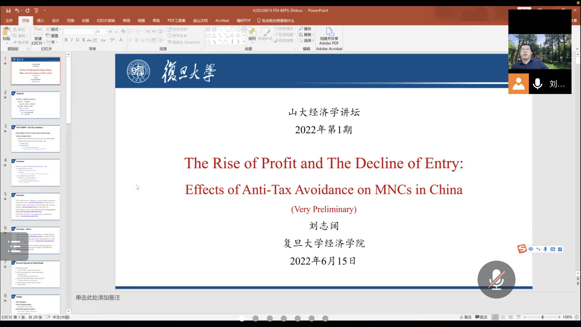 “山大经济学讲坛”2022年第1期在腾讯会议线上召开,复旦大学经济学院副教授、博士生导师,刘志阔应邀做了题为“The Rise of Profit and The Decline of Entry: Effects of Anti-Tax Avoidance on MNCs in China”的主题报告。香香腐宅