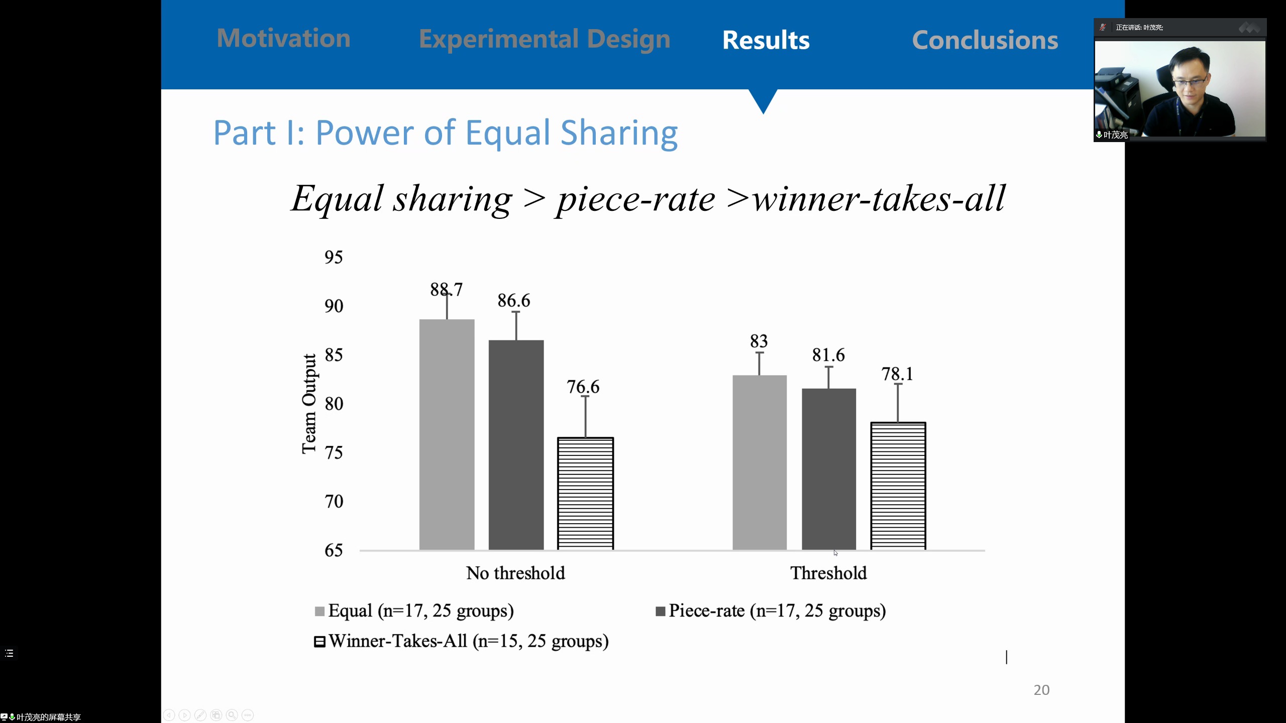 许多薪酬系统会根据团队的产出来支付,而团队的奖金则通常取决于团队是否完成指定的目标。对于这种以产出定报酬的薪酬系统来说,团队激励是至关重要的。叶老师通过设计实验来研究了对于具有不同能力的团队成员如何应对薪酬规则和团队的绩效门槛。在实验中,不同的团队会从平均分配、按劳分配和赢者通吃的分配方式中随机选取一种分配方式,并随机决定是否有门槛。结果显示,被随机到平均分配的团队比被分配到赢者通吃的团队具有更高的生产力,与按劳分配的团队生产力相似。根据内疚厌恶模型,能力较弱的工人为了避免让同伴失望而产生出内疚感,从而提高了生产力,促进了平均分配下的产出。在进一步的研究中,叶老师通过分析参与者之间的对话讨论,发现有门槛的团队会更有可能讨论合作。