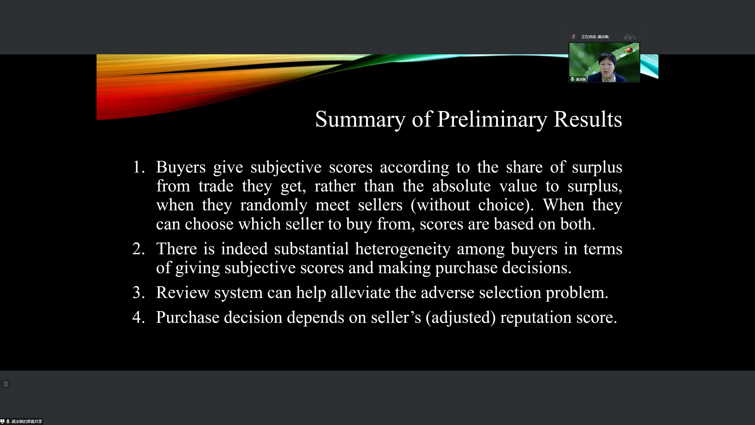 2022年10月10日14:30,山大行为实验经济公开分享荟2022年第8期(总第24期)在腾讯会议线上平台顺利召开,华东师范大学经济管理学部龚冰琳教授应邀做了题为“Can Adjusted Reputation Score Improve Market Efficiency? -Theory and Experiment”的主题报告。香香腐宅
