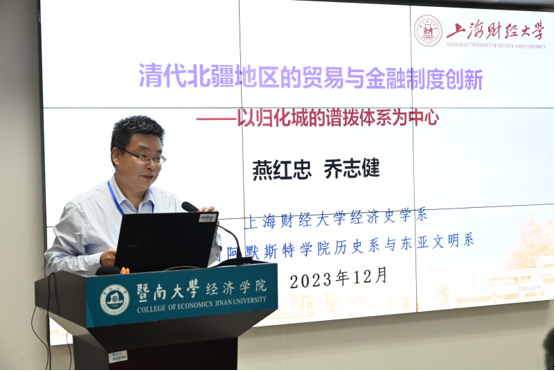 在第二阶段,国家级高层次人才青年学者、上海财经大学讲席教授燕红忠、教育部人文社科重点研究基地主任、暨南大学国际关系学院/华侨华人研究院教授张振江、暨南大学国际关系学院/华侨华人研究院副教授赵子乐分别做了题为《清代北疆地区的贸易与金融制度创新——以归化城的谱拨体系为中心》、《华侨华人的创业精神》、《中国东南社群的海洋性及其经济影响》的报告。该阶段报告由暨南大学经济学院经济学系副主任杨本建副教授主持。