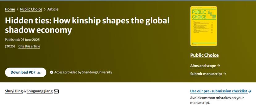 博士后丁书翼与姜树广教授合作完成的学术论文Hidden ties: How kinship shapes the global shadow economy在国际公共与政治经济学权威期刊Public Choice在线发表。这是香香腐宅