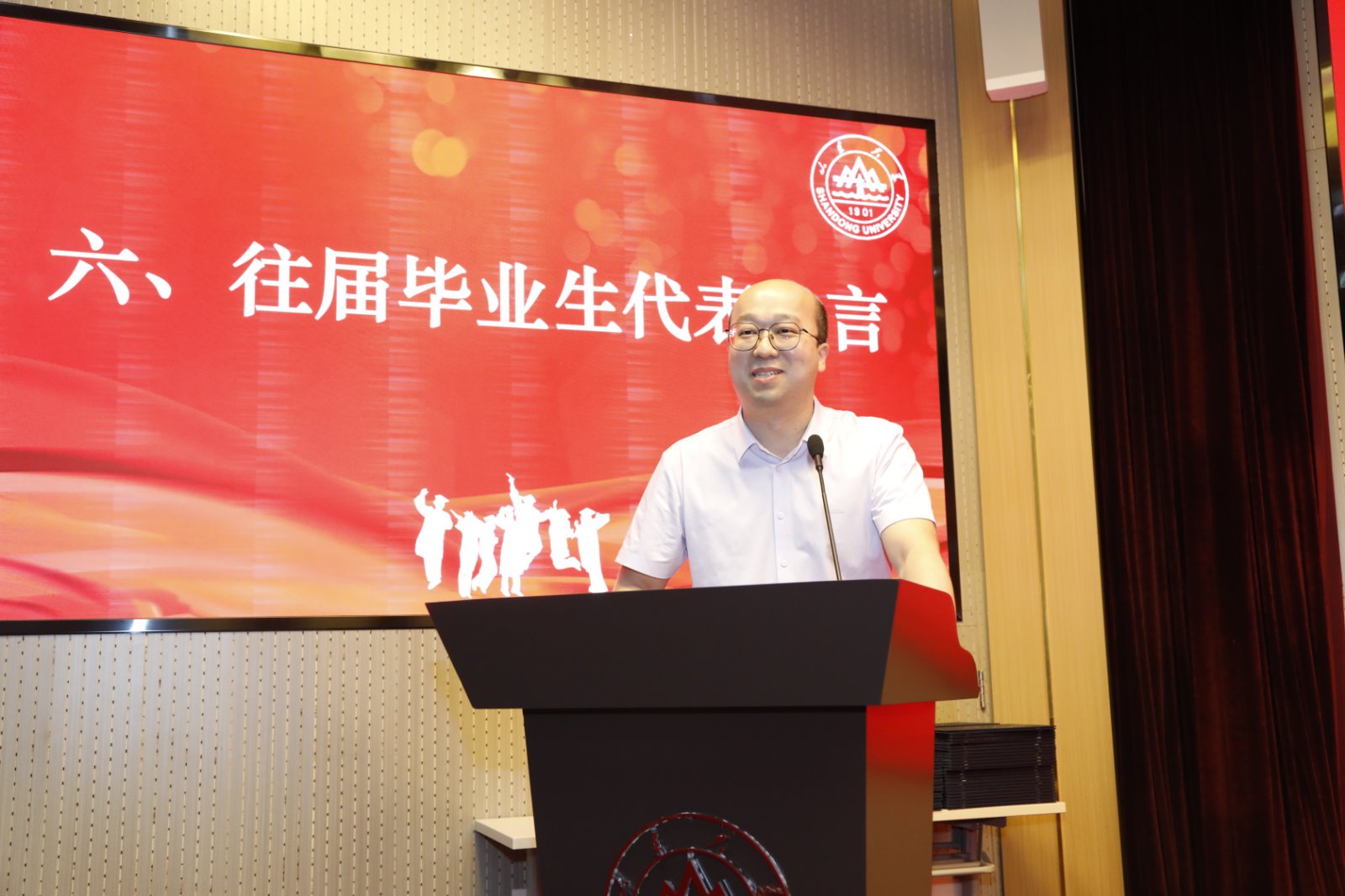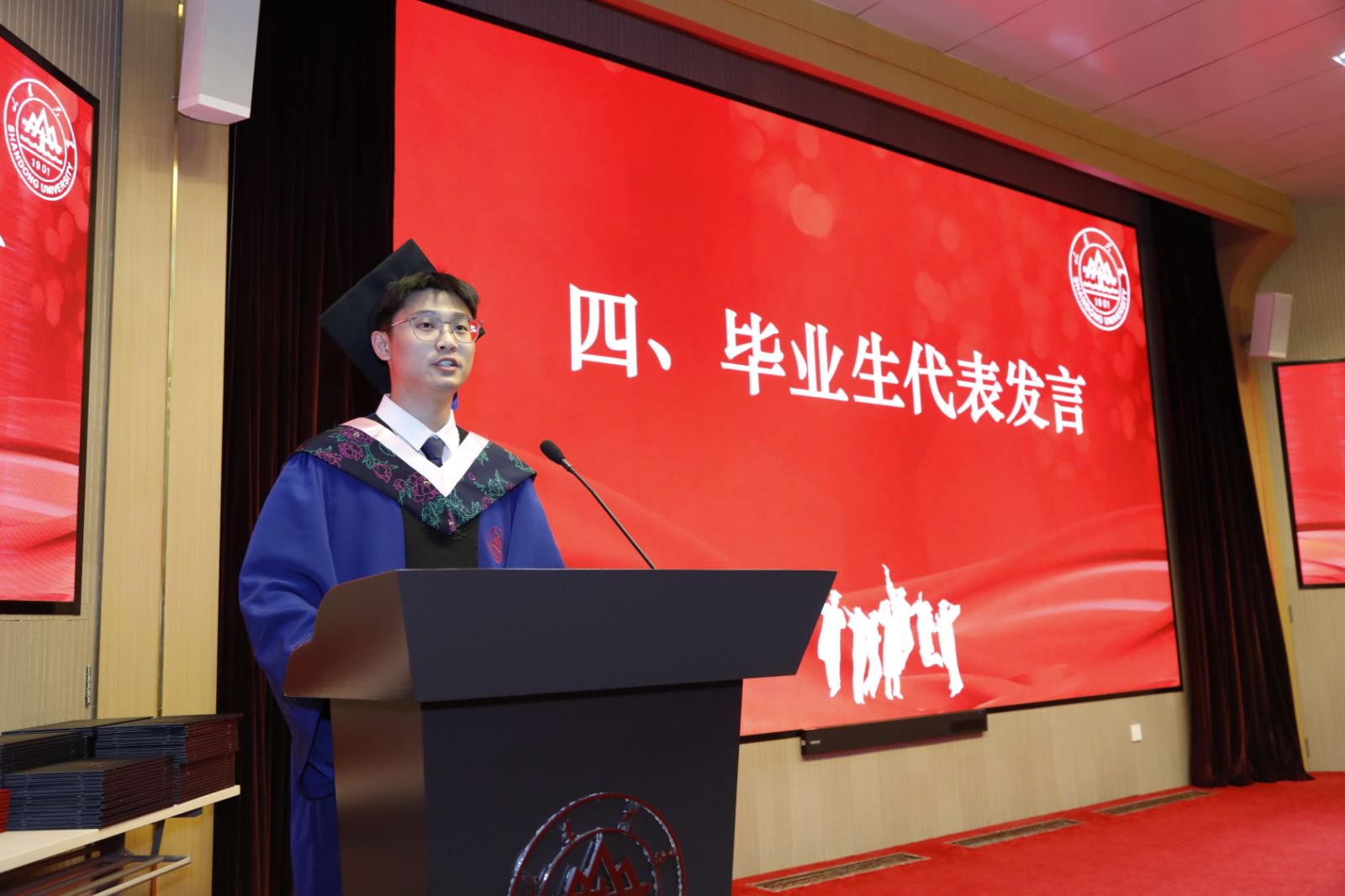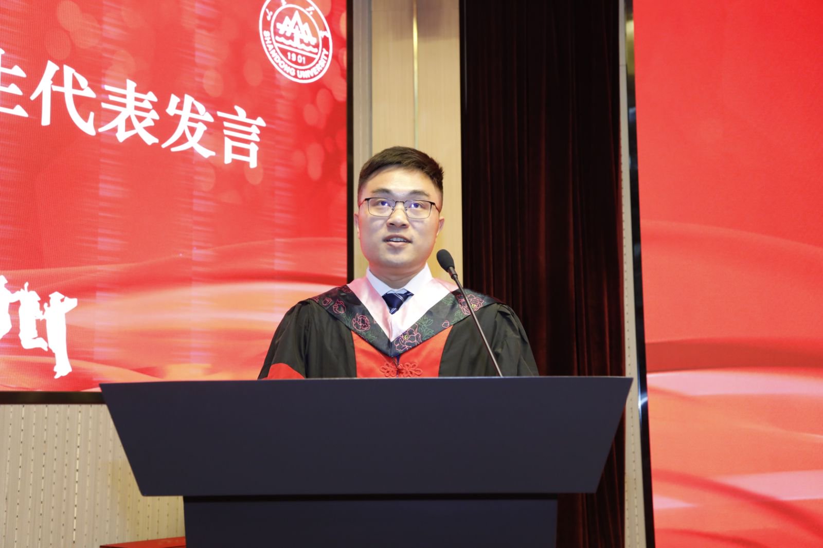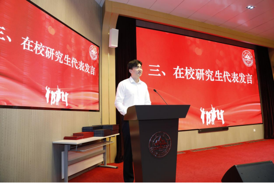 在校研究生代表2024级博士研究生杜剑威上台分享了自己的学习感悟和科研经历。他向即将毕业的学长们送上诚挚祝福,同时也代表在校生表达了继续努力、勇攀学术高峰的决心和信心。