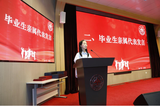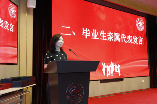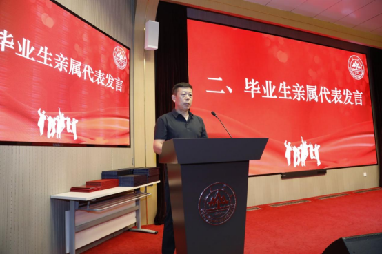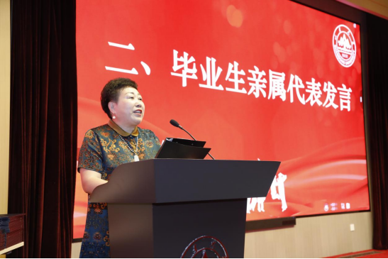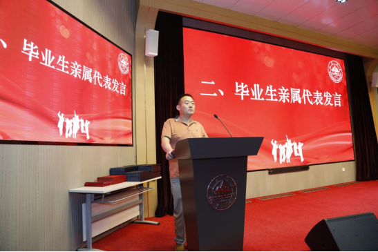 随后,毕业生亲属代表依次上台发言。张瑾琪父亲、纪爽父亲、孙显宗母亲、董婷婷母亲、刘懿母亲用温暖而真挚的话语,表达了对孩子们顺利毕业的热烈祝贺。他们回顾了孩子在求学道路上成长的点滴,也满含深情地送出了对毕业生们未来的殷切祝福,希望他们在未来的人生道路上脚踏实地、追逐梦想,成为有担当、有作为的社会栋梁。