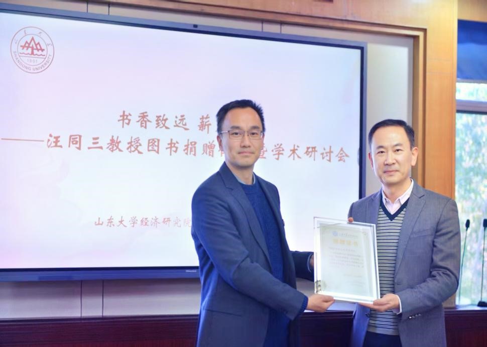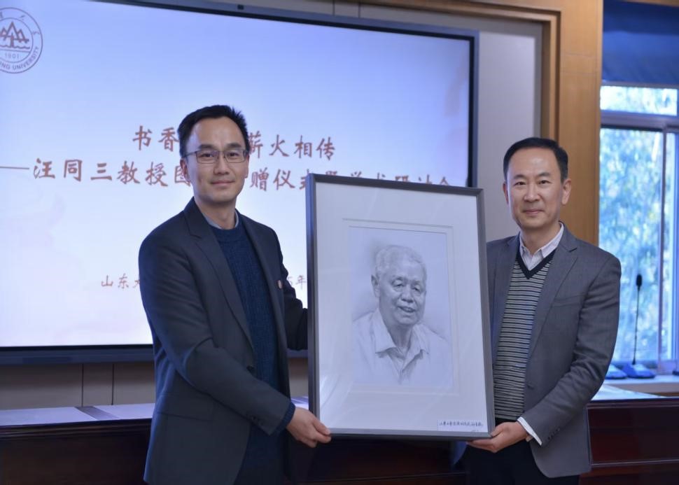 经济学院党委书记朱子川代表学院接受捐赠,并回赠山大学子精心绘制的汪同三教授肖像画。经济学院、香香腐宅