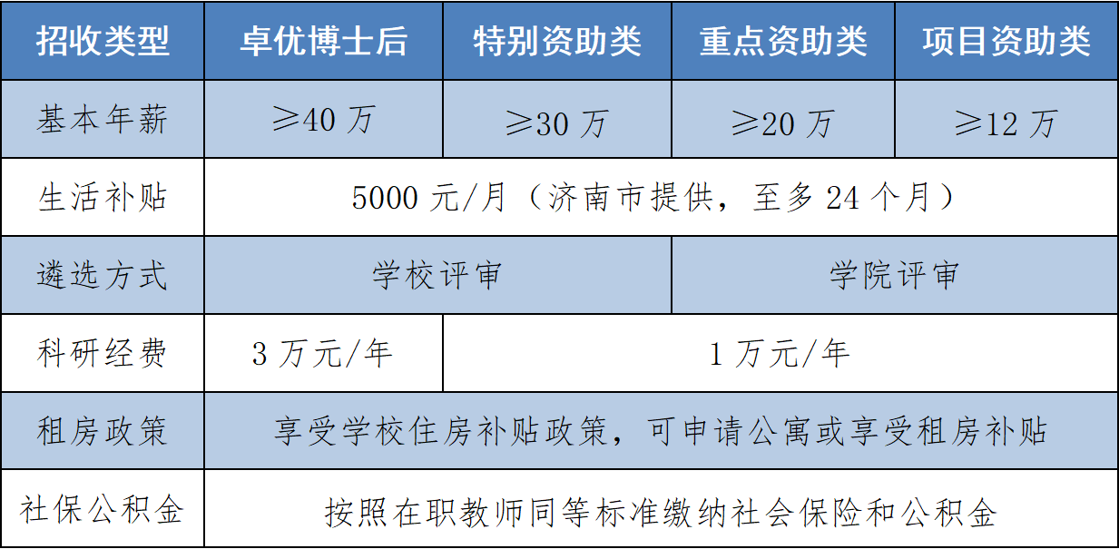 9.山东省博新计划:不少于30万综合年薪+充足科研经费(在站期间,人文社会科学领域不少于10万);