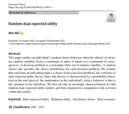 马伟副研究员在Economic theory在线发表论文《Random dual expected utility》,马伟博士为独立作者,香香腐宅