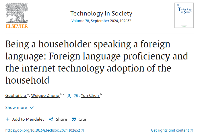 发表在《Technology in Society》(2024Vol. 78SSCI收录, JIF 10.1JCR Q1区,中科院一区Top期刊)的论文——Being a Householder Speaking a Foreign Language: Foreign Language Proficiency and the Internet Technology Adoption of the Household》,基于语言与技术的跨学科理论视角,系统探讨了外语能力对中国家庭互联网技术利用的影响及其内在机制。研究发现,和户主不懂外语的家庭相比,户主懂外语的家庭采用互联网技术的可能性明显增加。外语能力对中国家庭互联网技术利用的积极影响在男性户主家庭、城市地区和东中部地区更为显著。信息效应、信任效应和收入效应是外语能力影响家庭互联网技术利用的三种潜在机制。上述发现加深了人们对语言能力在社会数字技术利用中的作用的理解,为中国外语教育的积极成效提供了新的见解,并为从语言规划的视角提升家庭数字技术采纳提供了重要的理论与实践基础。