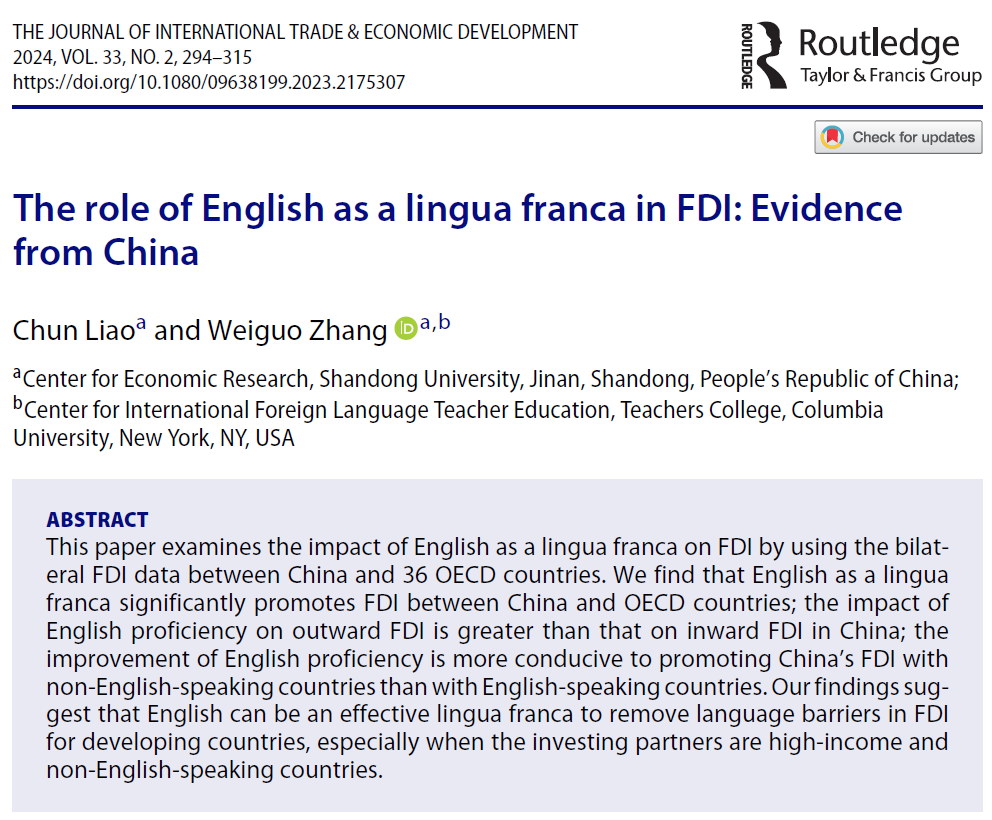 发表在《Journal of International Trade & Economic Development》(2024Vol. 33SSCI收录,JIF2.2JCR Q2区)的论文——The Role of English as a Lingua Franca in FDI: Evidence from China》,利用1997-2019年中国和 36 个经合组织(OECD)国家间的双边数据,研究了英语作为通用语言对外商直接投资的影响。研究发现,英语作为通用语言极大地促进了中国与经合组织国家之间的外商直接投资。此外,英语水平对中国外向投资的影响大于对内向投资的影响。与英语国家相比,提高国民英语水平更有利于促进中国与非英语国家的外商直接投资。上述结果表明,作为一种国际通用语言,英语可以有效地克服发展中国家在对外直接投资中的语言障碍,特别是当投资伙伴是高收入国家和非英语国家的时候。论文的贡献在于,揭示了国家语言能力在对外贸易和直接投资中的重要作用,为语言与投资研究提供了中国的经验证据。