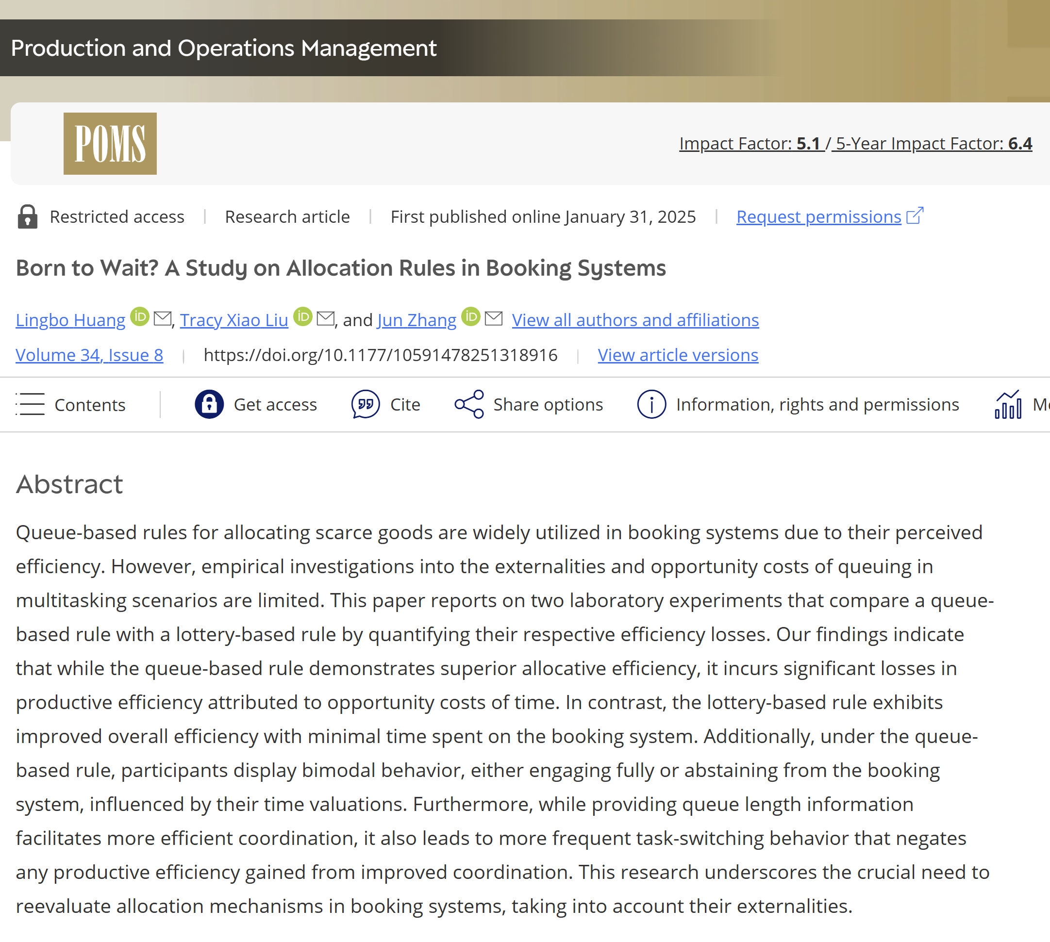 黄凌波教授与清华大学刘潇教授以及南京审计大学张军教授合作的研究“Born to Wait? A Study on Allocation Rules in Booking Systems”发表于Production and Operations Management的2025年8月刊。《Production and Operations Management》(POM)是美国生产与运作管理学会(POMS)的旗舰学术期刊,聚焦运营管理、供应链、服务与数据驱动决策等领域的原创研究。该刊被UTD 24(德州大学达拉斯分校商学院顶级期刊名单)收录,在国际商管与运营管理学界具有广泛影响力。