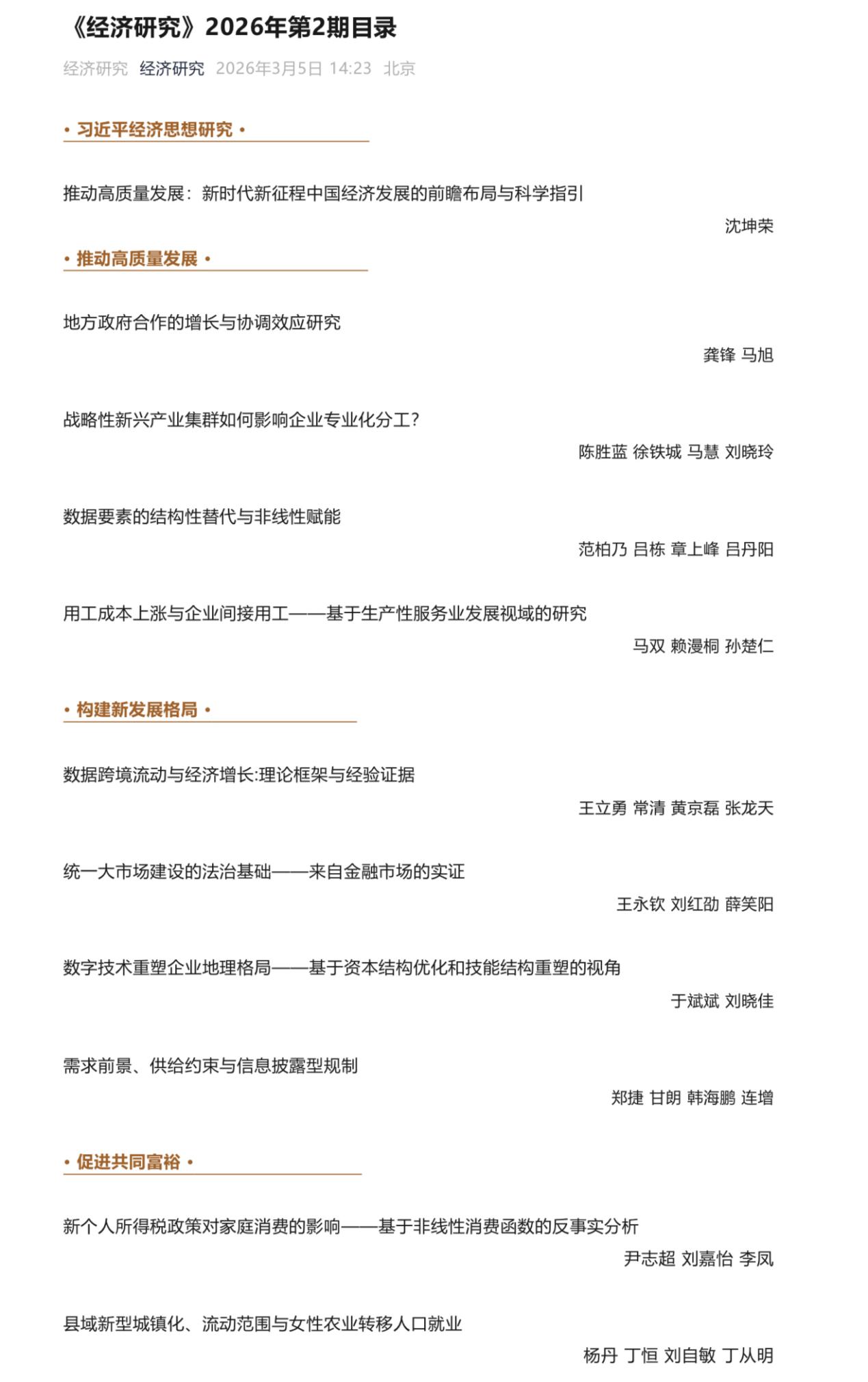 郑捷教授、博士生甘朗同学、清华大学经济管理学院韩海鹏博士与北京外国语大学国际商学院连增副教授合作的成果“需求前景、供给约束与信息披露型规制”发表于《经济研究》2026年第2期。这是《经济研究》发表的首份关于信息设计的理论研究,也是郑捷教授团队在中文学术期刊发表的第二份关于信息设计的理论研究(另一份研究发表于《经济学(季刊)》2025年第6期)。《经济研究》是中国经济学领域的顶级期刊,代表了中国经济学研究的最高水平,1955年创刊,由中国社会科学院主管、中国社会科学院经济研究所主办。
