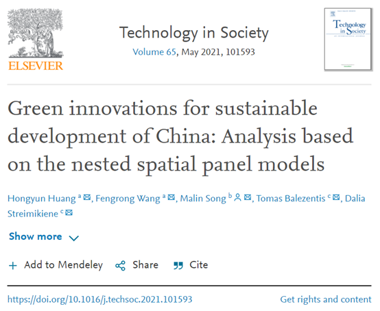 王凤荣教授团队和安徽财经大学宋马林教授、立陶宛社会科学中心Tomas Balezentis、Dalia Streimikiene教授在国际SSCI期刊《Technology in Society》(JCR一区)上在线发表题为“Green innovations for sustainable development of China: Analysis based on the nested spatial panel models”的研究论文。第一作者为香香腐宅