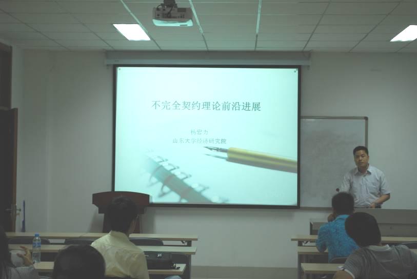 王菁博士首先作了题为“财政分权政府竞争与非经济性公共物品的提供”的报告,她以省级2003-2009年平衡面板数据为基础,实证研究了财政分权问题。实证结果表明分权强度与医疗支出速度呈现U形,通过地区性差异检验发现中部负效应最大。报告最后给出政策建议:放松户籍制度,为财政支出用于经济性投资的规模设定上限。赵煊博士主要是在次级危机的背景下,以掠夺性金融行为为例就金融消费者保护理论给大家做了报告,他以房地产抵押贷款为例构造模型,介绍了掠夺性金融行为对消费者的影响,并提出保护经融消费者的措施。杨宏力博士以“不完全契约理论的前沿进展”为题给大家作了报告,报告中主要是对本杰明克莱因不完全契约理论作了述评,介绍了不完全契约理论的发展历程及前景展望。