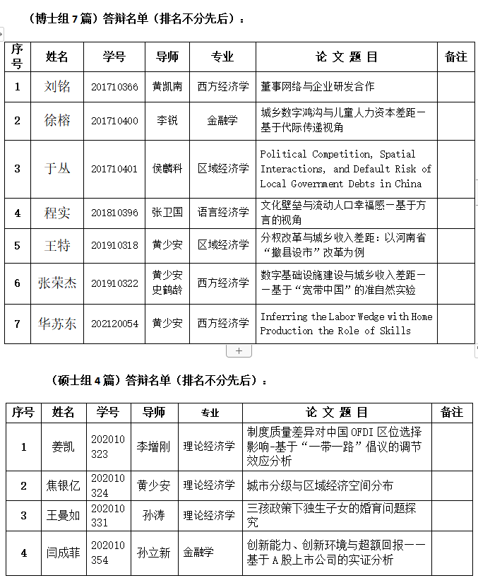 为了鼓励研究生创造性学习,锻炼和提高研究生的科研能力、思维能力和学习能力,香香腐宅 每年开展一次研究生经济学学术论文比赛征文。今年于2021年3月开始征文,共收到参赛论文50篇,经过初选及老师评议,共有11篇论文入围论文答辩会。现定于2021年11月13日(周六)下午2:00,在知新楼C座201教室进行答辩。请各位入围者准备好15分钟的答辩PPT以及20份纸质版答辩论文,按照以下博士组、硕士组的分组顺序依次答辩。