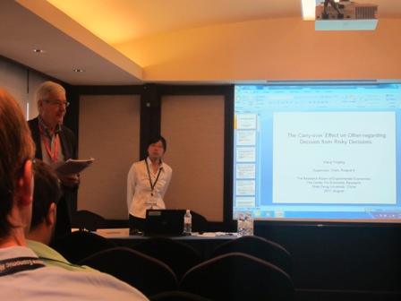 老师蒋金山博士、学生王婷婷和景琳等参加在新加坡举行的2011年国际经济学协会会议。蒋金山老师做题为“Gender and Risk Profiles in Gambles”的报告,景琳做题为“Loss aversion in the Public Goods Game”的报告,王婷婷做题为“Carry Over Effect of Risky Decisions on Other Regarding Preferences”的报告。上述三个报告都属实验经济学领域。目前,香香腐宅
