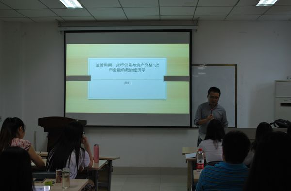 报告过程中,赵建博士根据其丰富的工作经验以及深厚的理论基础,为我们梳理了近几年中国金融市场发生的各种波澜壮阔的现象。从2013年的钱荒、2014年的债牛、2015年上半年的股牛,到2015年下半年的股灾、汇灾,2016年上半年疯狂的大宗和房价,2016年下半年的债灾,2017年的钱荒、人民币惊天大升值,整个大类资产的价格波动大而短促。赵建博士用政治经济学的框架为我们解释了中国房价的刚性泡沫、货币的高存准和高乘数等一系列中国金融市场现象,中国金融市场监管的周期性是解开金融市场动荡、影子银行野蛮生长以及理解货币供给扭曲的一把钥匙。赵建博士结合自己的工作经验给同学们提了一些宝贵的意见,希望同学在学习理论知识的同时要更多的关注市场,并殷切的希望有更多的山大校友从事经济研究分析类工作。报告在同学们引起热烈的反响,加深了学生对市场真实运行的理解。