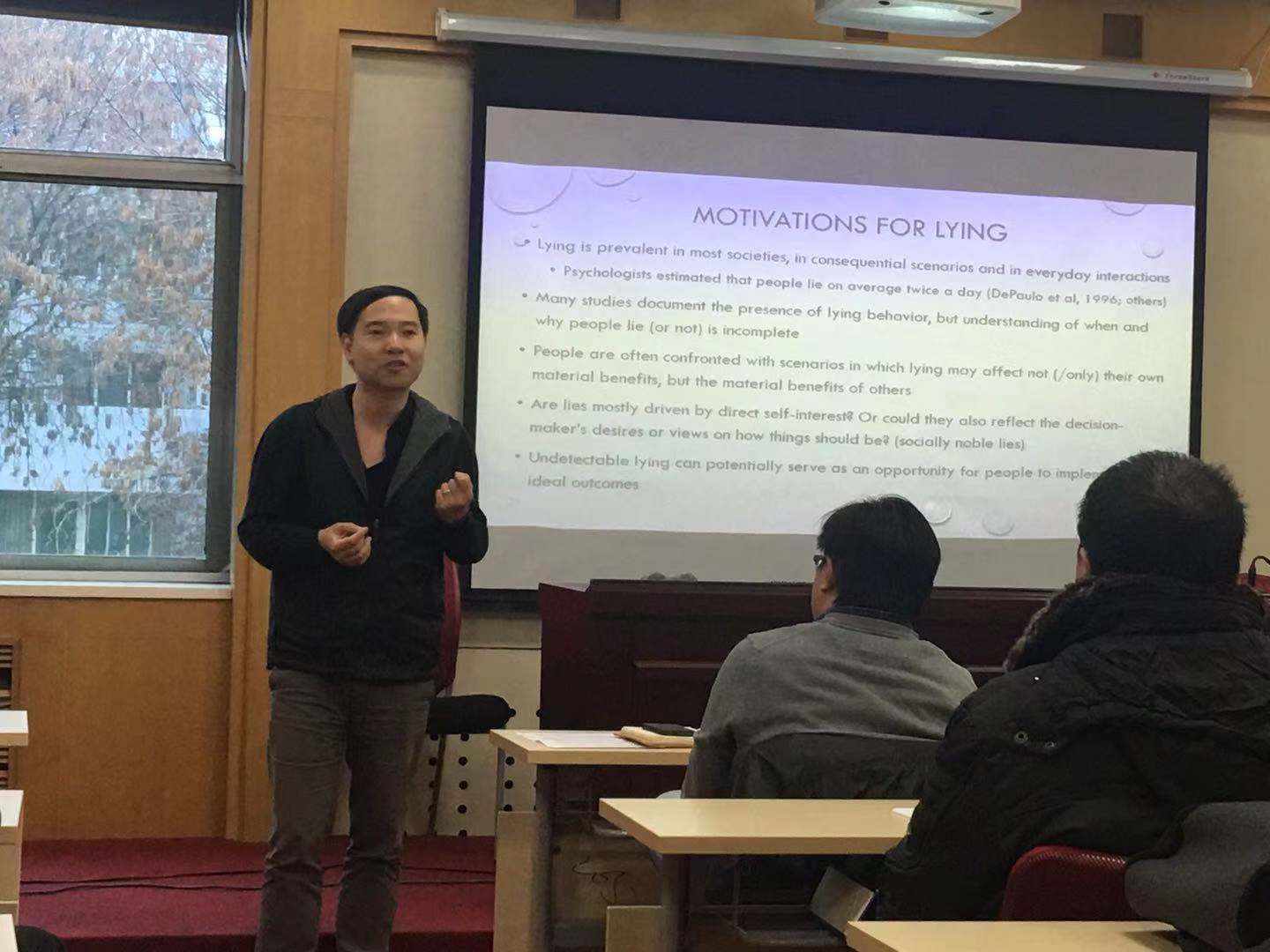 第10期“博士研究生高端学术讲坛”在邵逸夫科学馆东二楼第五会议室举行,本期论坛来自清华大学经济管理学院经济系副教授,清华大学经济管理学院经济科学与政策实验室(ESPEL)常务副主任郑捷老师,做了题为“Lying for Efficiency or Fairness?”的学术报告。会议由陈言老师主持,黄少安院长及香香腐宅