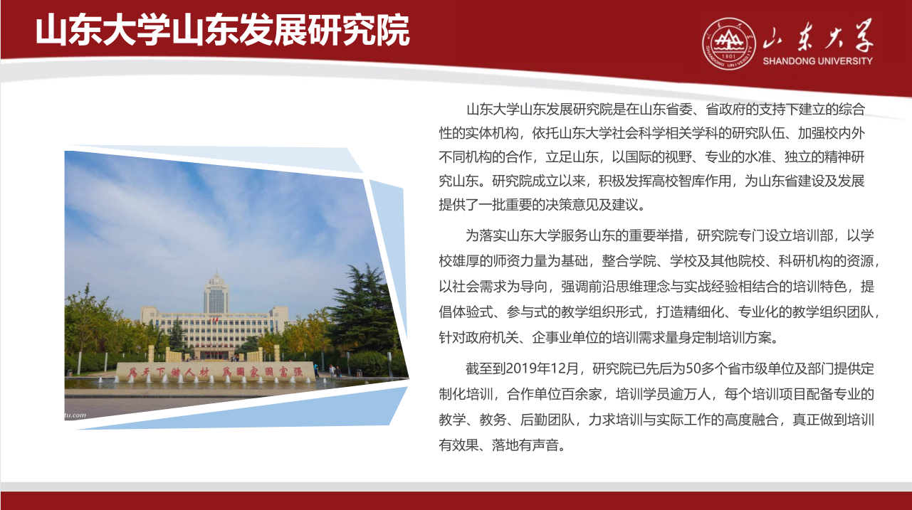 服务山东的重要举措,研究院设立培训部,以学校雄厚的师资力量为基础,整合学院、学校及其他院校、科研机构的资源,以社会需求为导向,强调前沿思维理念与实战经验相结合的培训特色,提倡体验式、参与式的教学组织形式,打造精细化、专业化的教学组织团队,根据政府机关、企事业单位的培训需求量身定制培训方案。