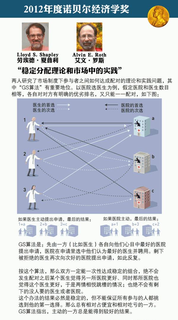 瑞典皇家科学院表示,今年的诺贝尔经济学奖得主关注经济学的一个中心问题:如何尽可能适当地匹配不同市场主体。比如,学生必须与学校相匹配,人体器官的捐献者必须与需要移植器官的接受者相匹配。这样的匹配如何尽可能有效地完成?什么样的方法对什么样的人群有益?今年的诺贝尔经济学奖授予的这两位学者,分别从稳定匹配的抽象理论和市场制度的实际设计两个角度,对上述问题作出了自己的回答。