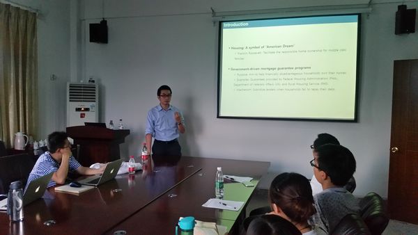 邵逸夫科学馆401会议室作了主题为“Government Driven Mortgage Guarantee Program and Macroeconomic Effects”的学术报告。林晨副院长、王高望副教授、陈言博士以及其他部分博士硕士生参加了活动。